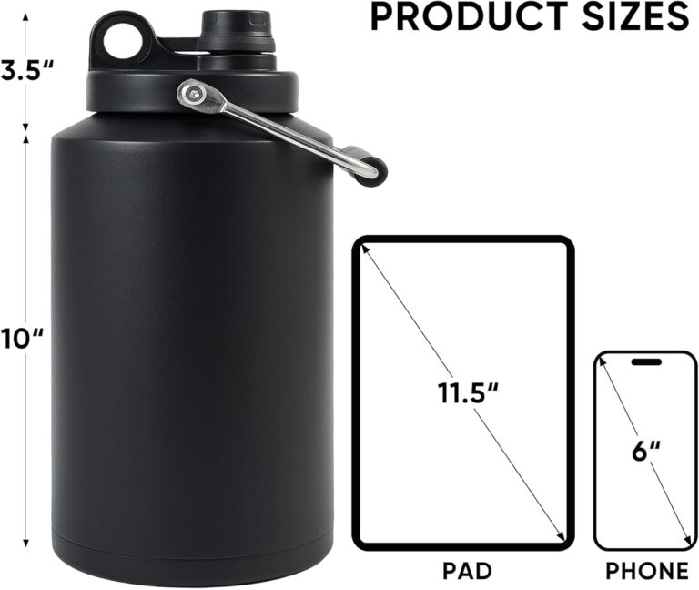 Insulated Jug with Handle, One Gallon, 128oz Stainless Steel, Large Double Vacuum Water Bottle for Hot & Cold Drinks, Wide Mouth, Sweat Proof, Great for Travel, Hiking & Camping, Black